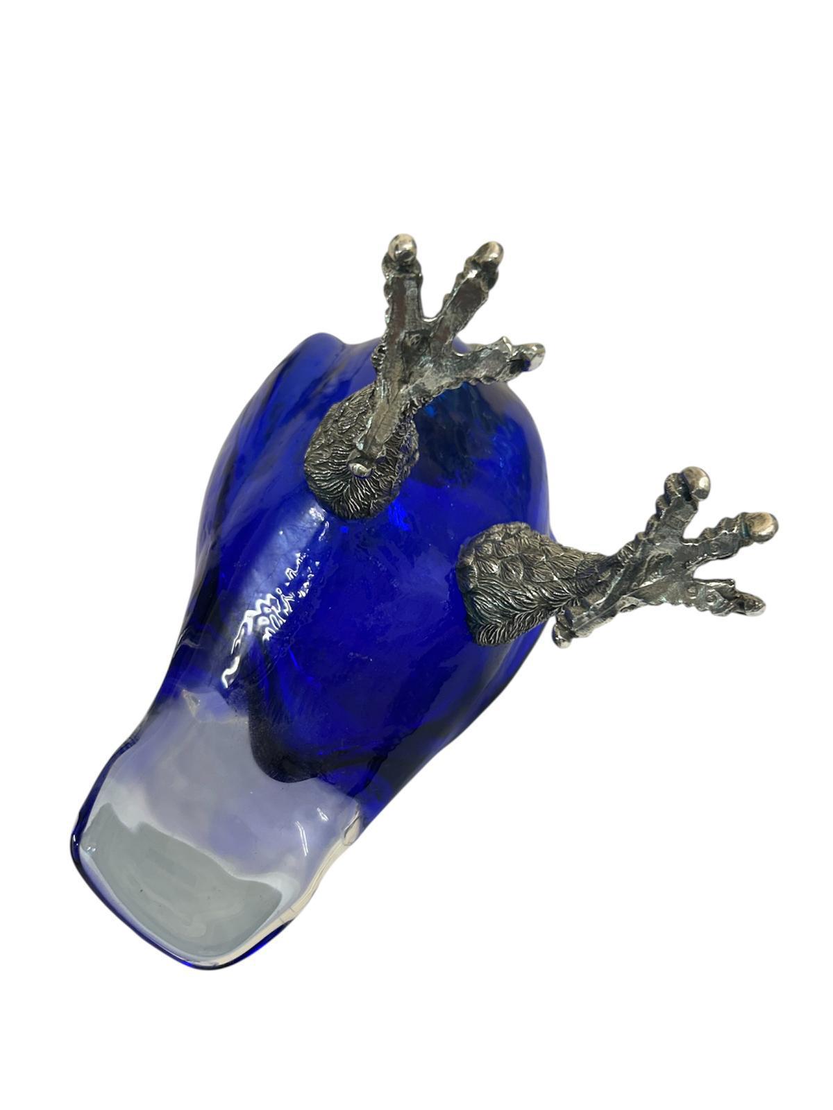 Victorian style silver plated claret jug in the form of a standing eagle with beautifully detailed cast hinged head and has a hallmark on the neck with a blue glass body and a clear glass handle standing on two cast claw legs and the red eyes are glass.