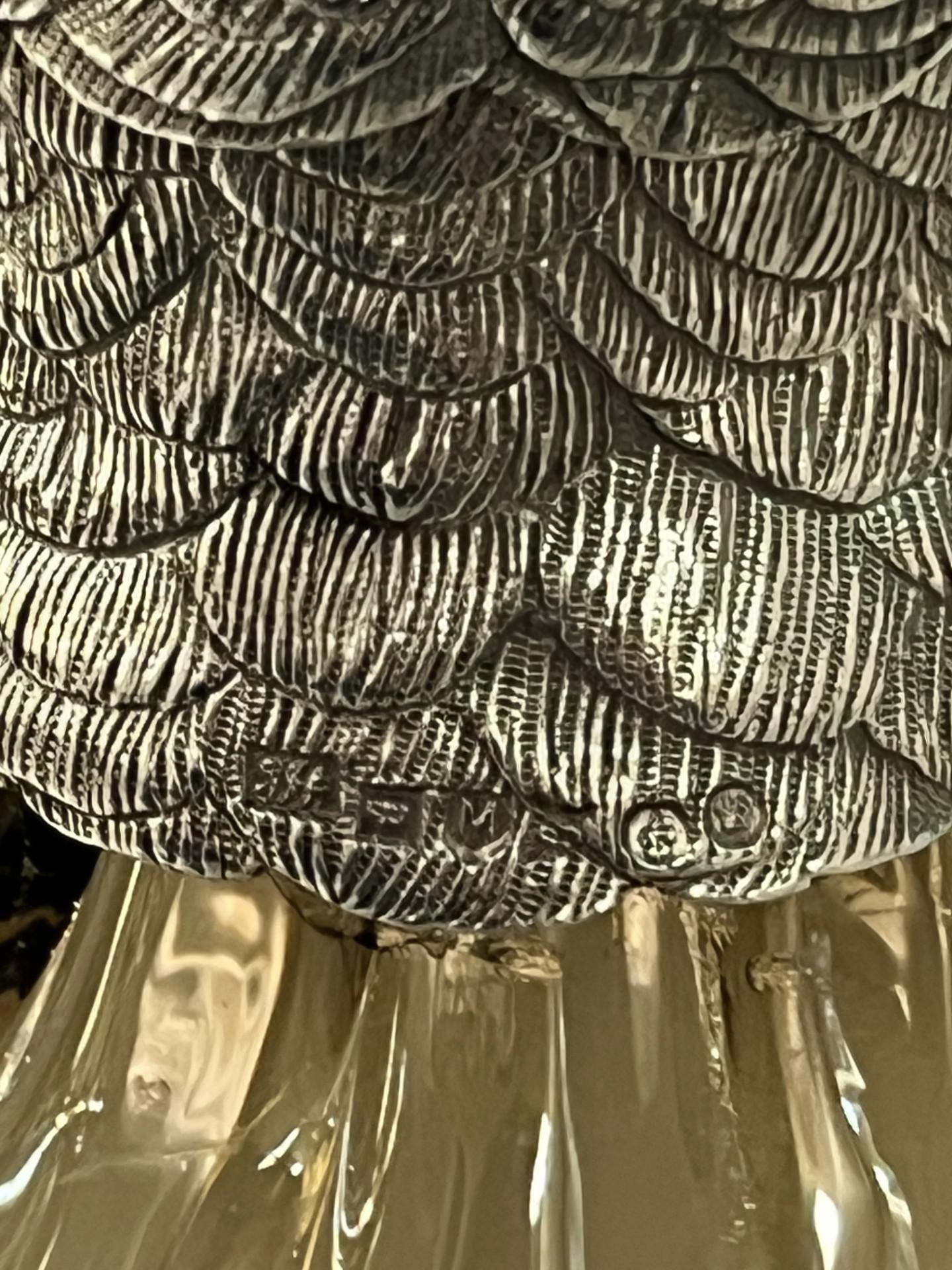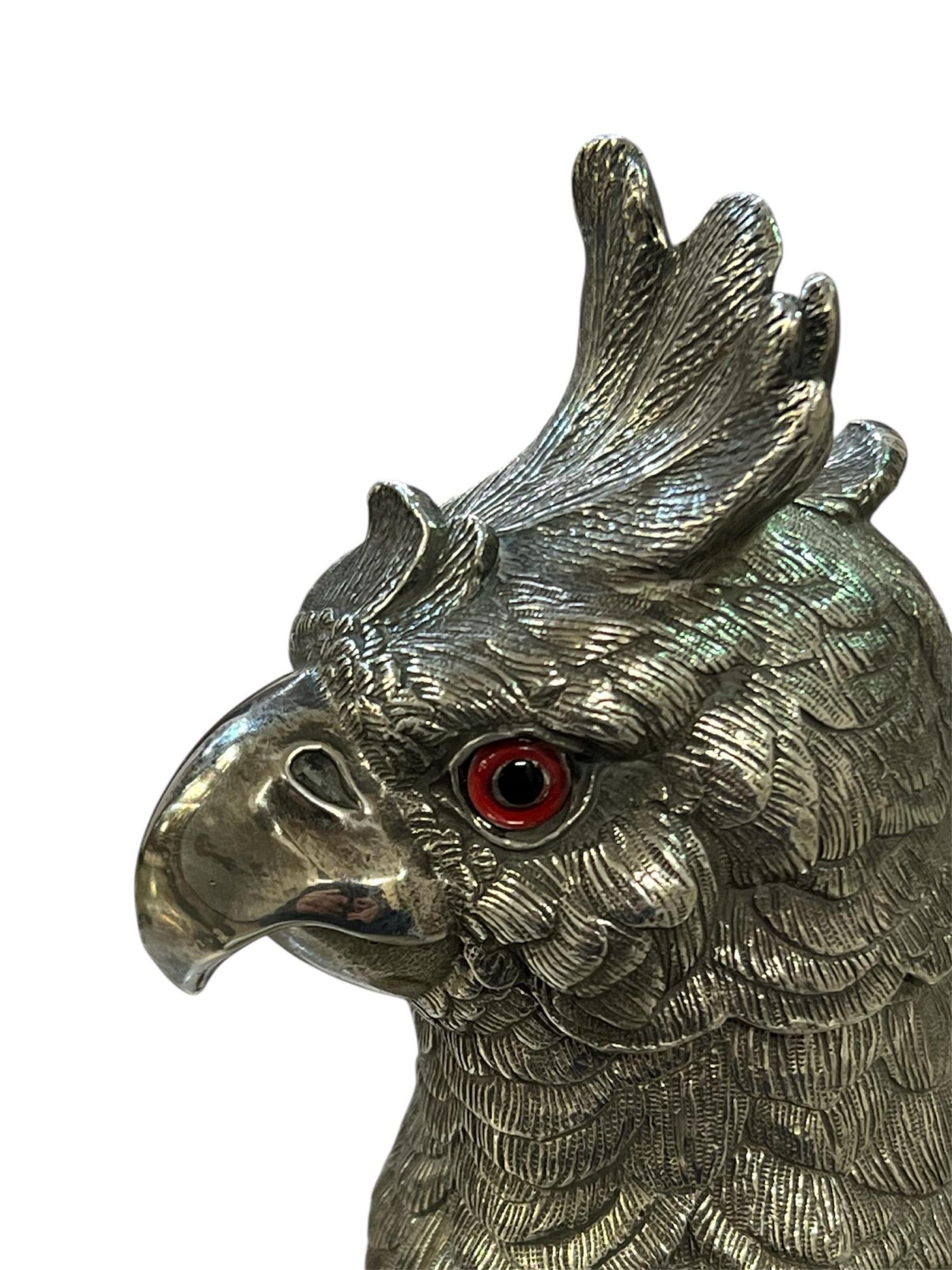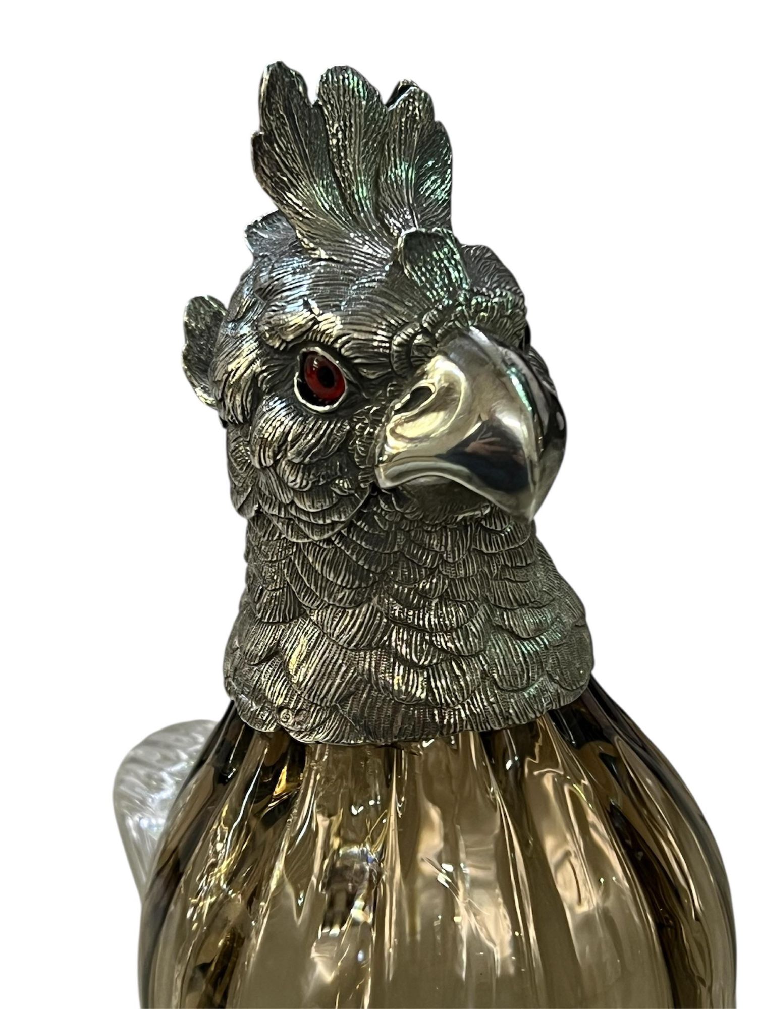 Victorian style silver plated claret jug in the form of a standing parrot / cockatoo with beautifully detailed cast hinged head and has a hallmark on the neck with a graduated brown glass body and a clear glass handle standing on two cast claw legs and the red eyes are glass.