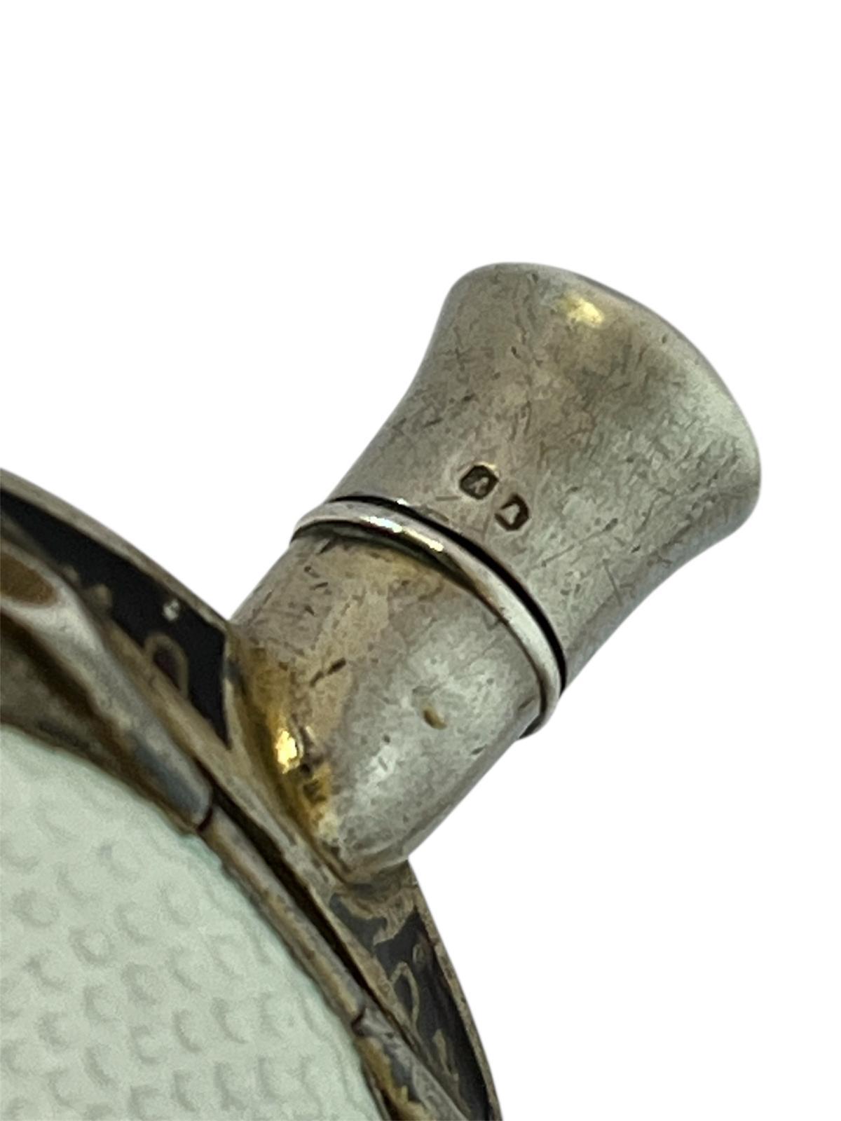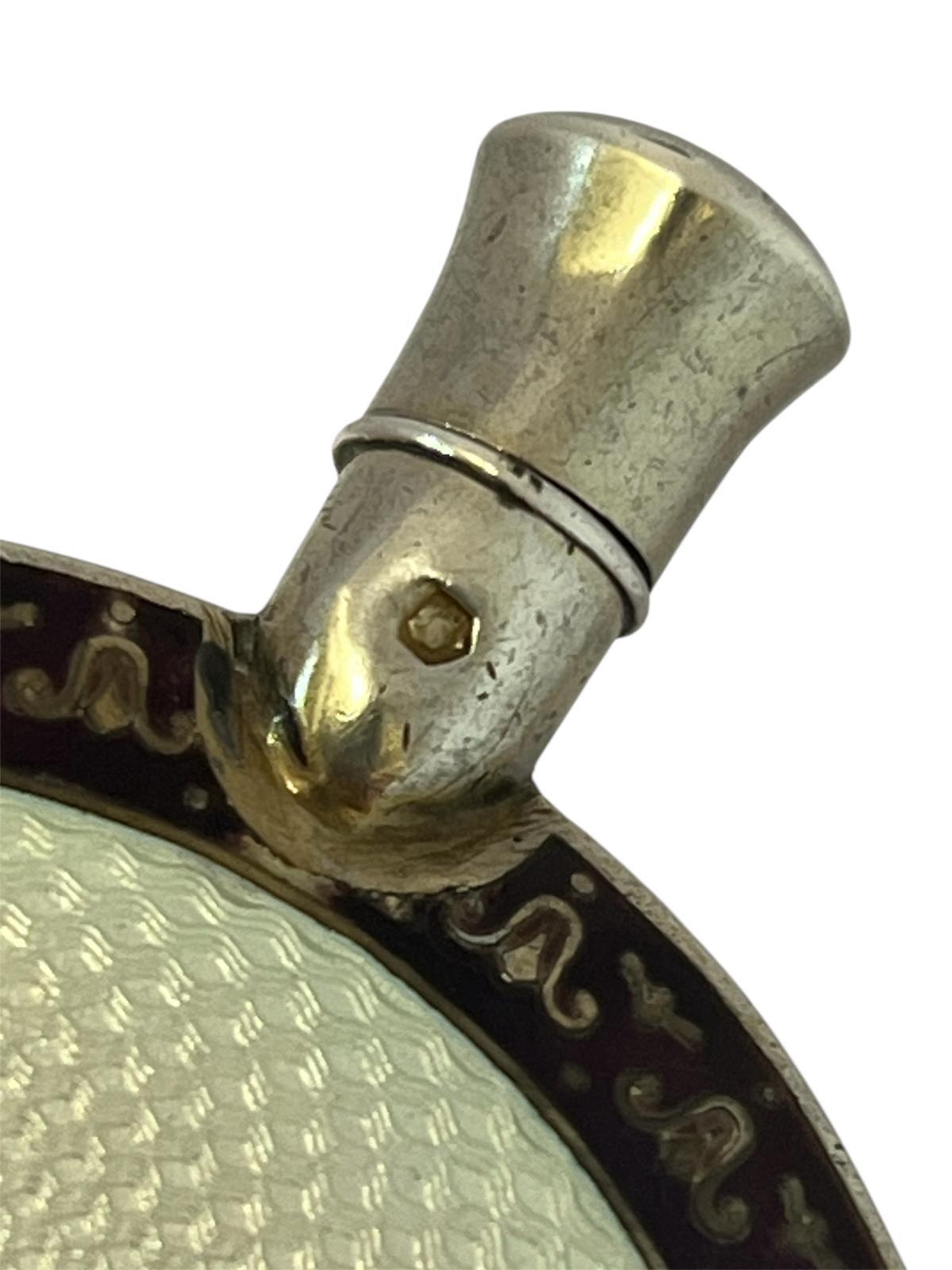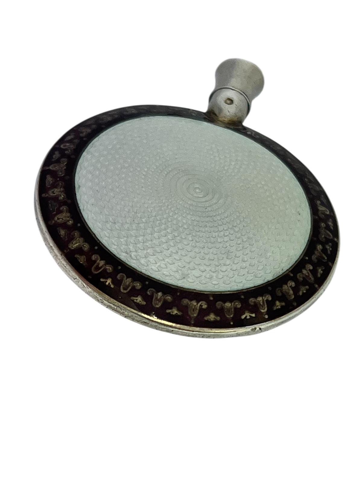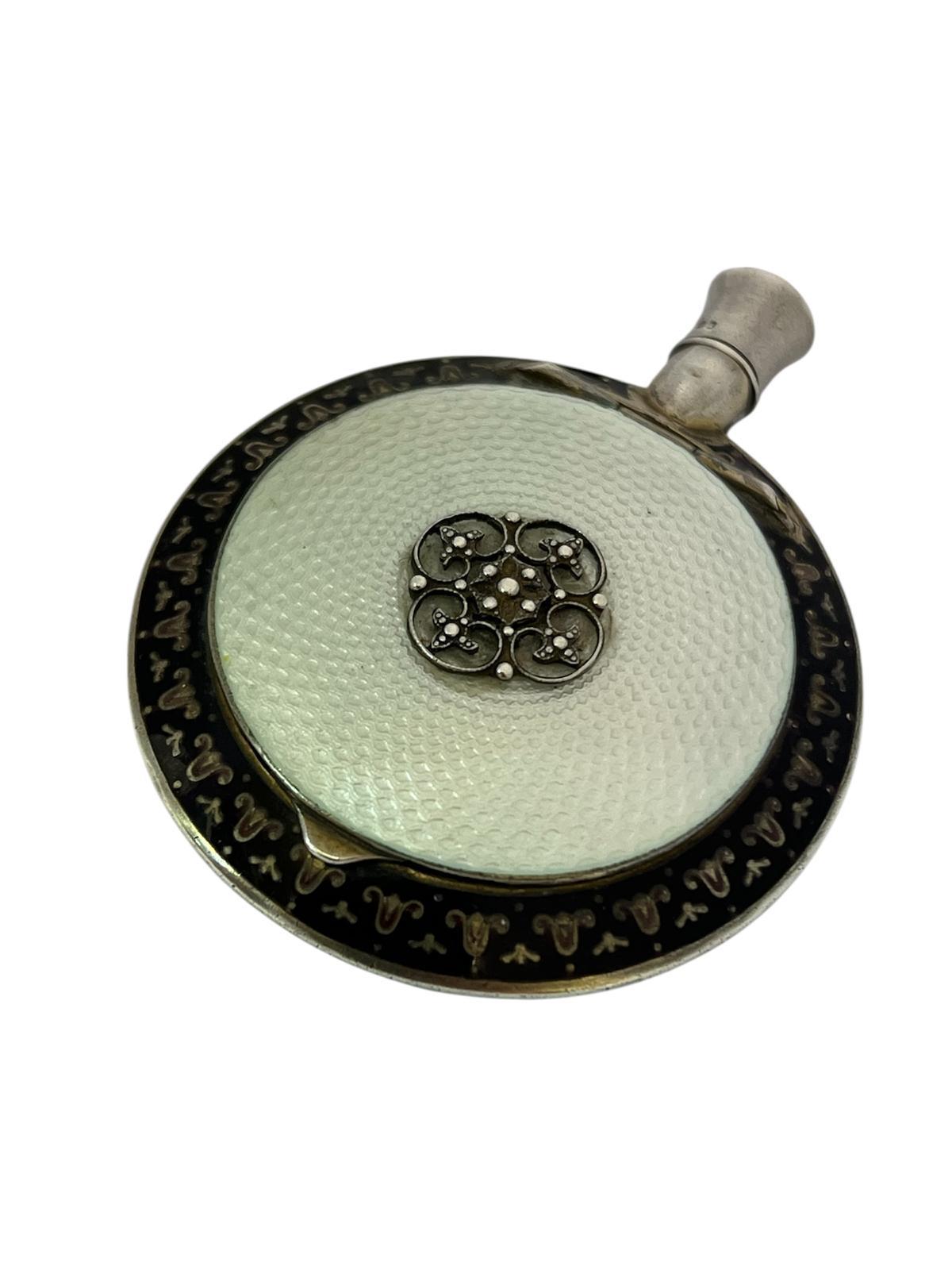 An elegant antique silver and enamel combination perfume bottle and compact mirror, likely of French origin. The circular form is beautifully finished with a textured white enamel panel, framed by a dark enamel border decorated with repeating classical motifs. At the centre, a raised silver decorative mount adds refinement and visual interest.