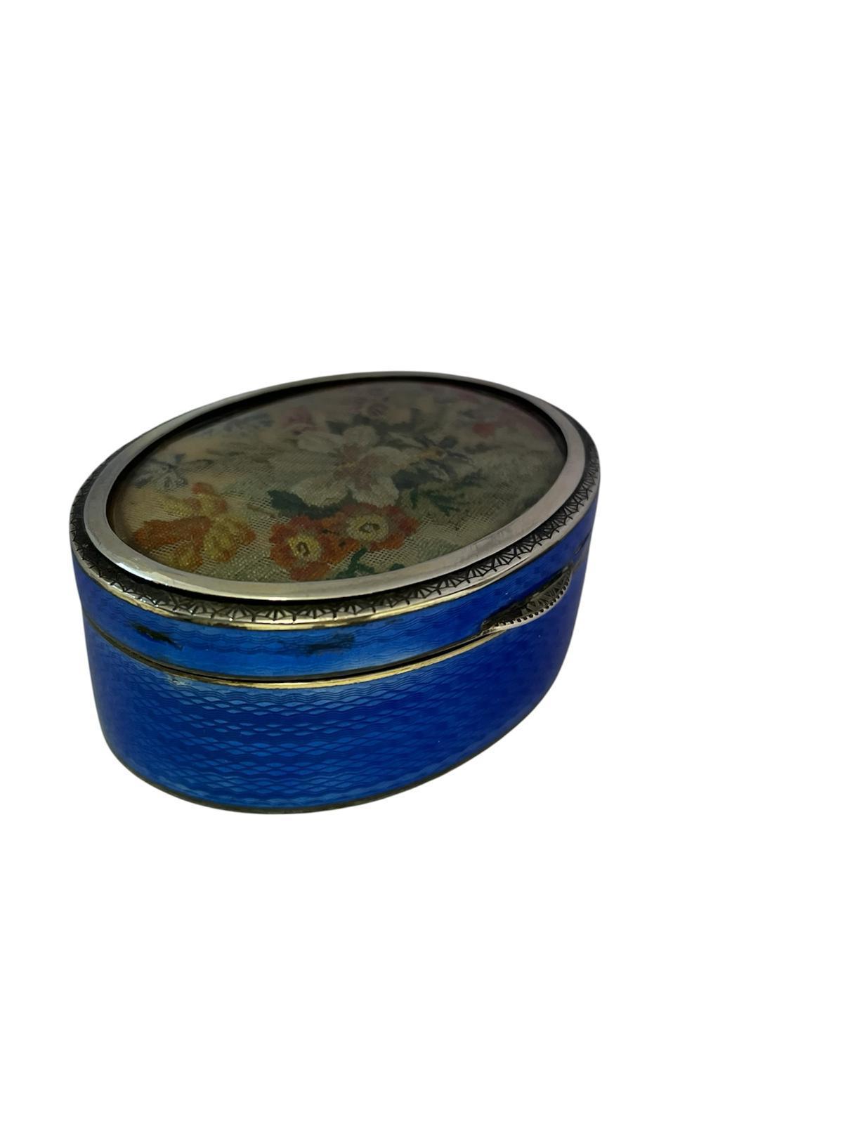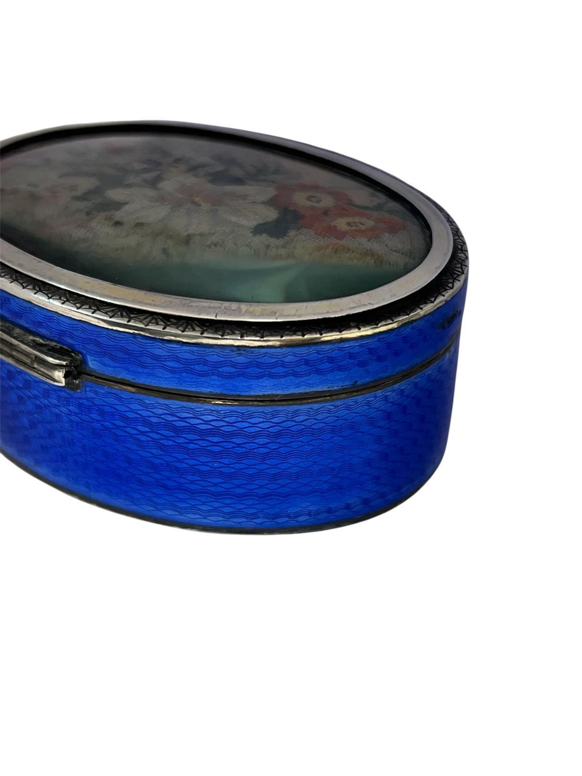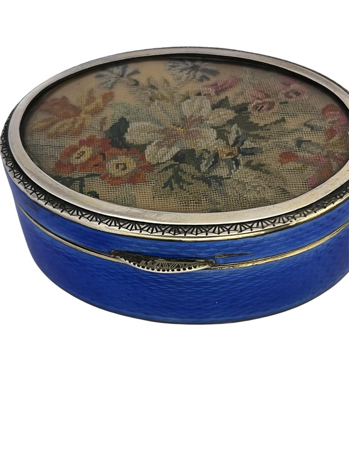 Silver and enamel antique box featuring blue guilloché enamel and a lid with a needlepoint floral scene under glass, likely designed for holding pills or snuff.