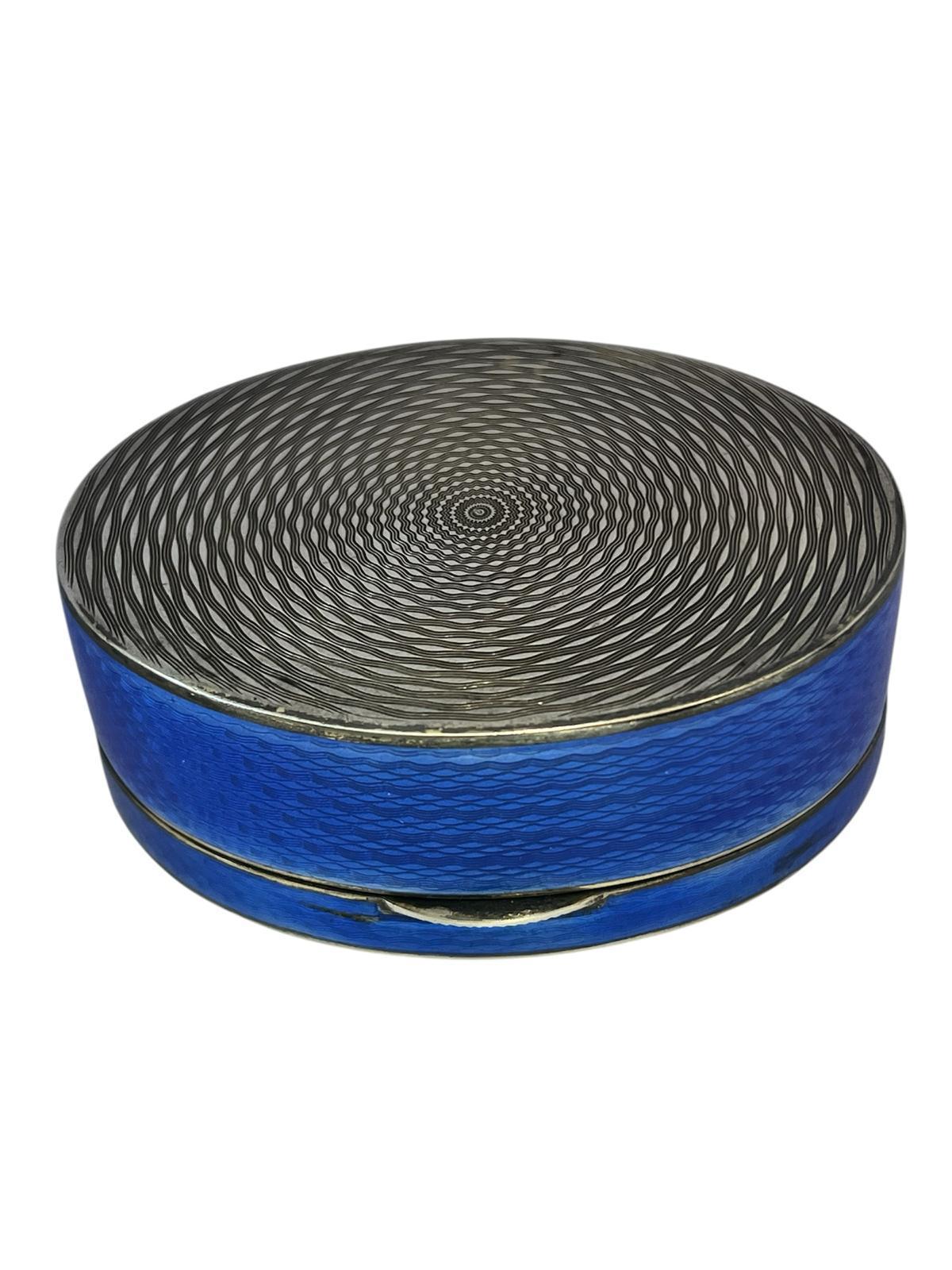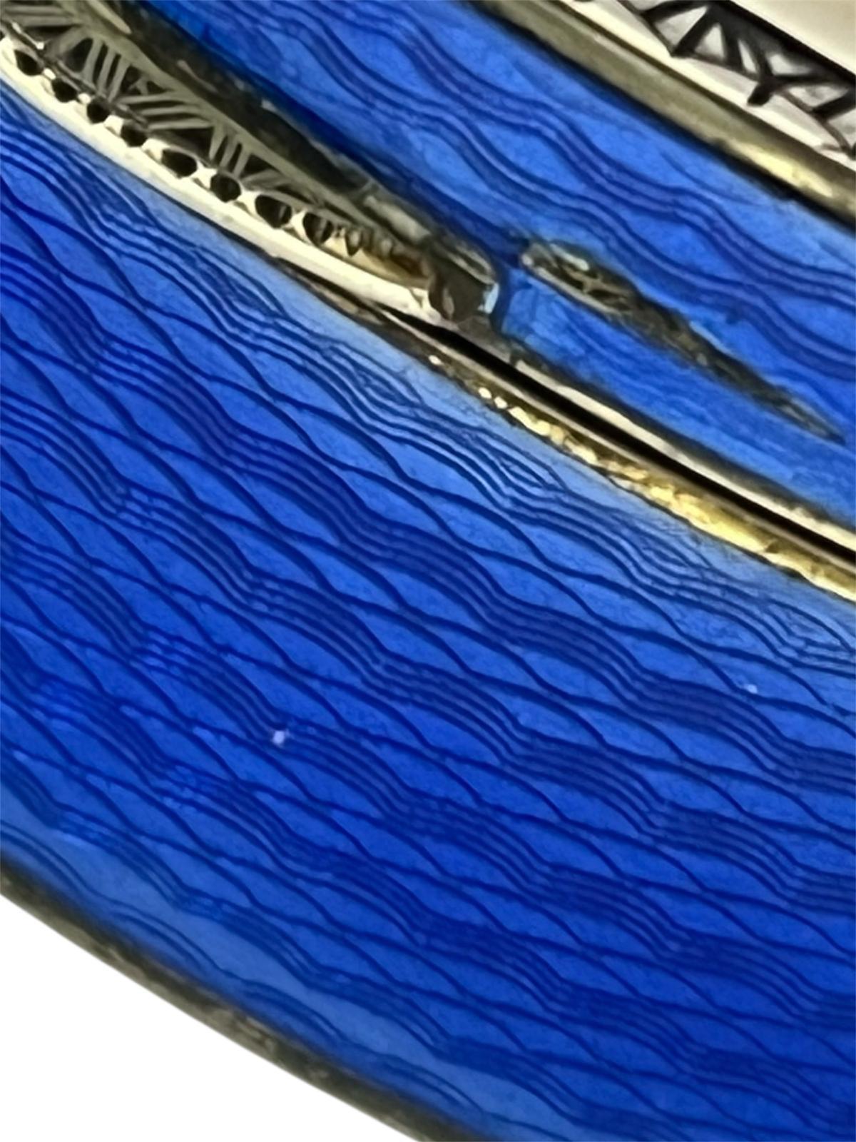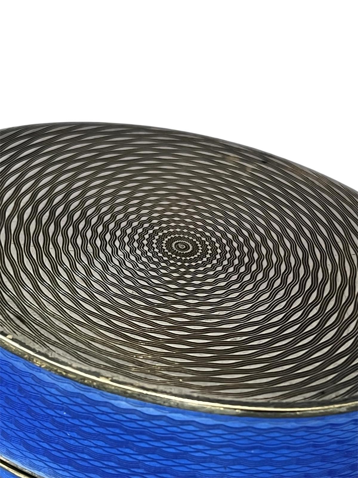 A beautifully crafted antique oval box featuring vibrant cobalt blue guilloché enamel over a finely engine-turned ground. The rich translucent enamel reveals the intricate wave pattern beneath, framed by delicate silver mounts with engraved detailing.