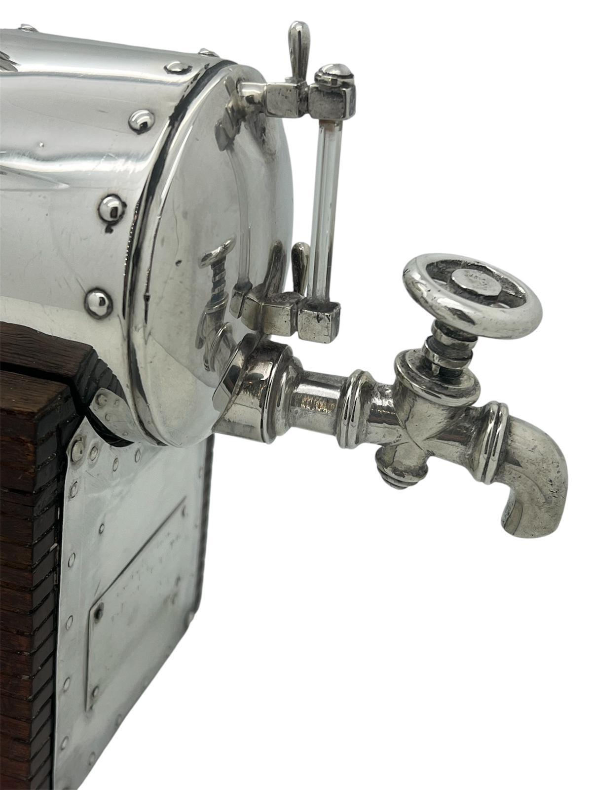 A Continental silver novelty decanter - Circa 1900 in the form of a steam engine boiler, with indistinct plaque to front, on a walnut faux brick stand.