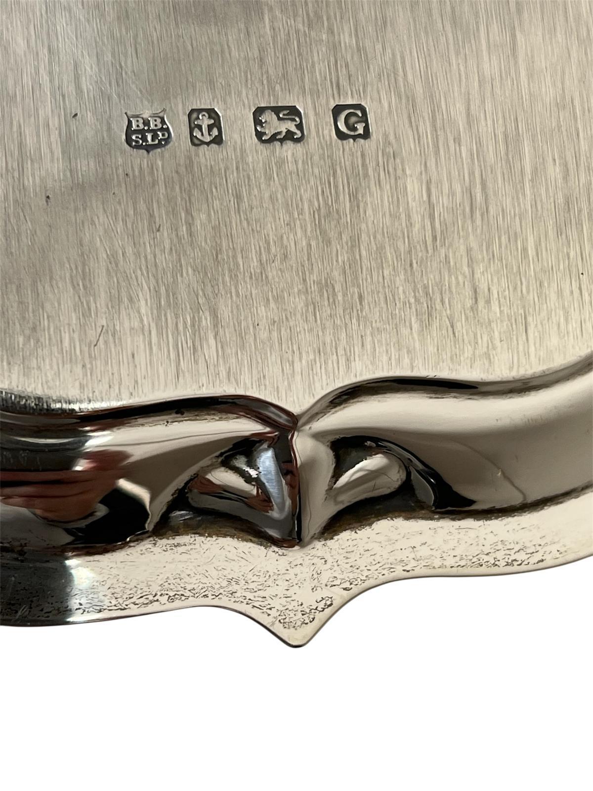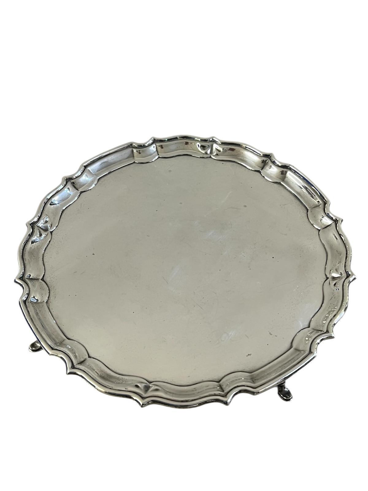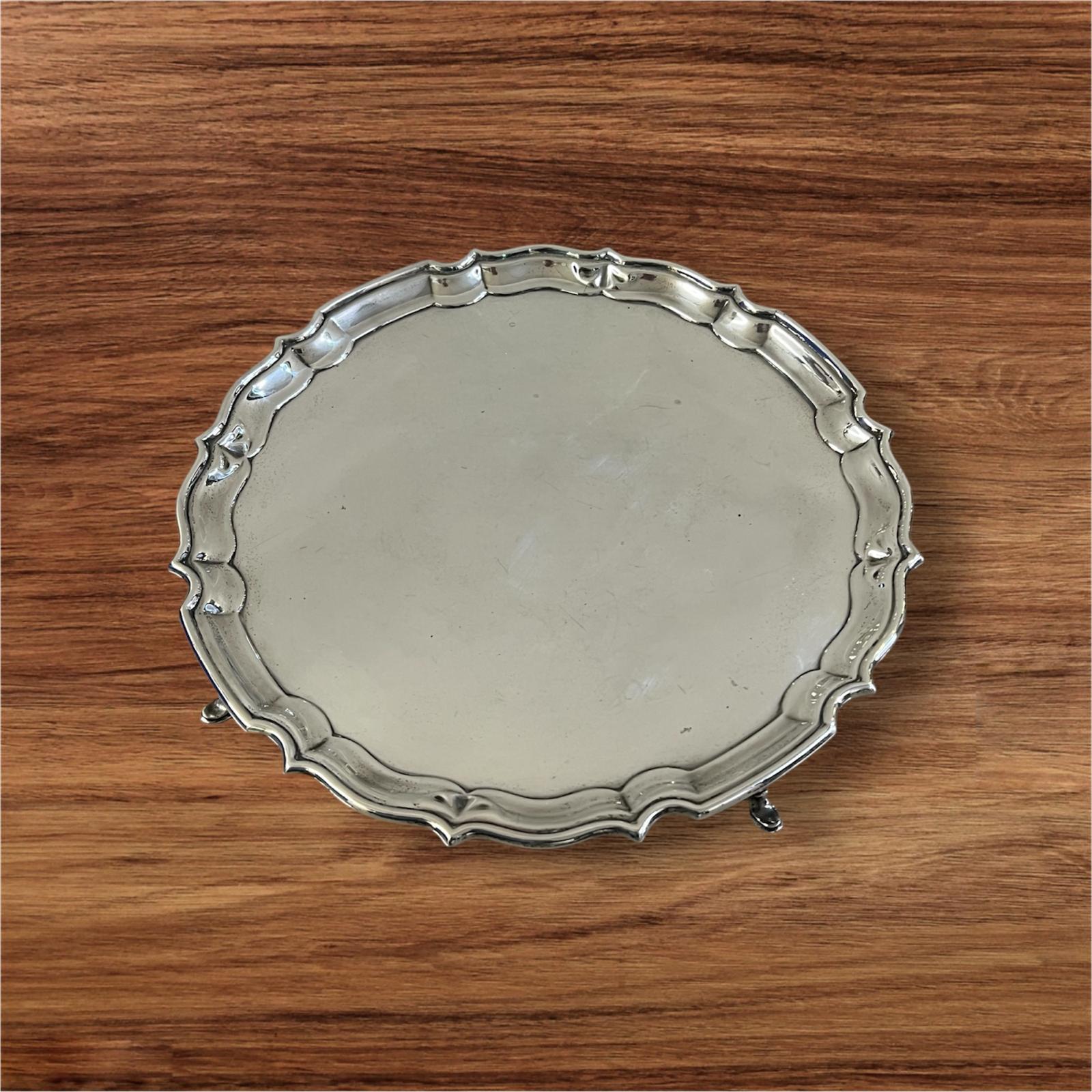 English hallmarked silver salver with Chippendale border on four pad feet, made in Birmingham 1931, by Barker Brothers