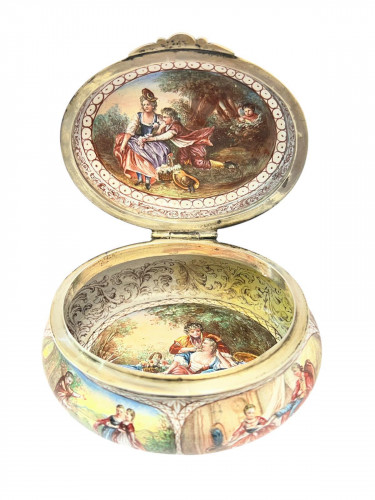 An Austrian Viennese Enamel Vase / Urn with gorgeous Viennese enameling on all exterior and interior surfaces. The Exterior surfaces show detailed images of figures in classical clothing in outdoor settings. The bottom of the body of the Vase is half fluted and the fluted areas are enameled with gorgeous patterning. The interior of the Urn has patterned enameling. The Urn has two ornate handles.