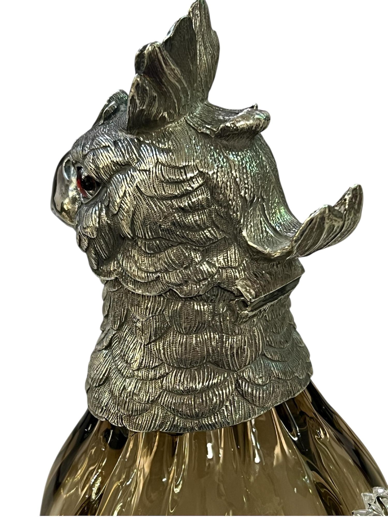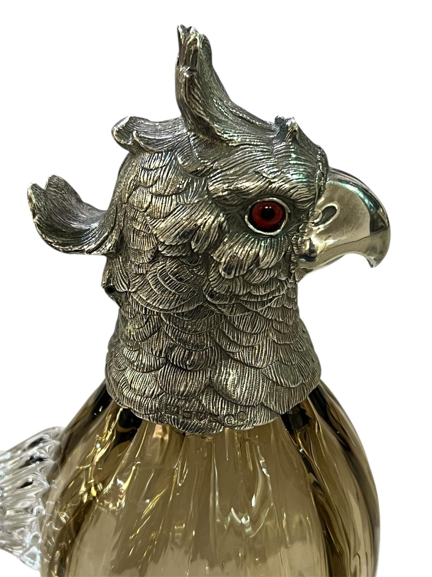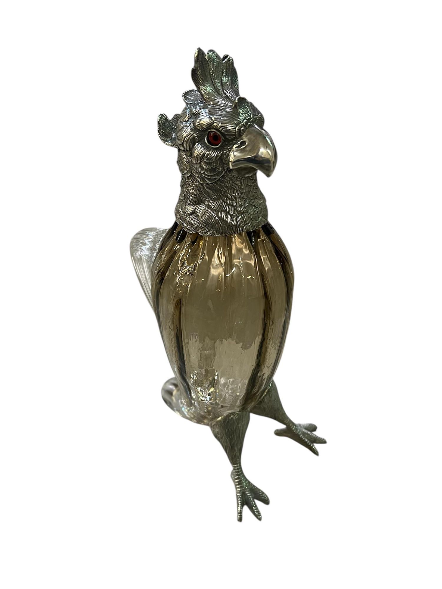 Victorian style silver plated claret jug in the form of a standing parrot / cockatoo with beautifully detailed cast hinged head and has a hallmark on the neck with a graduated brown glass body and a clear glass handle standing on two cast claw legs and the red eyes are glass.