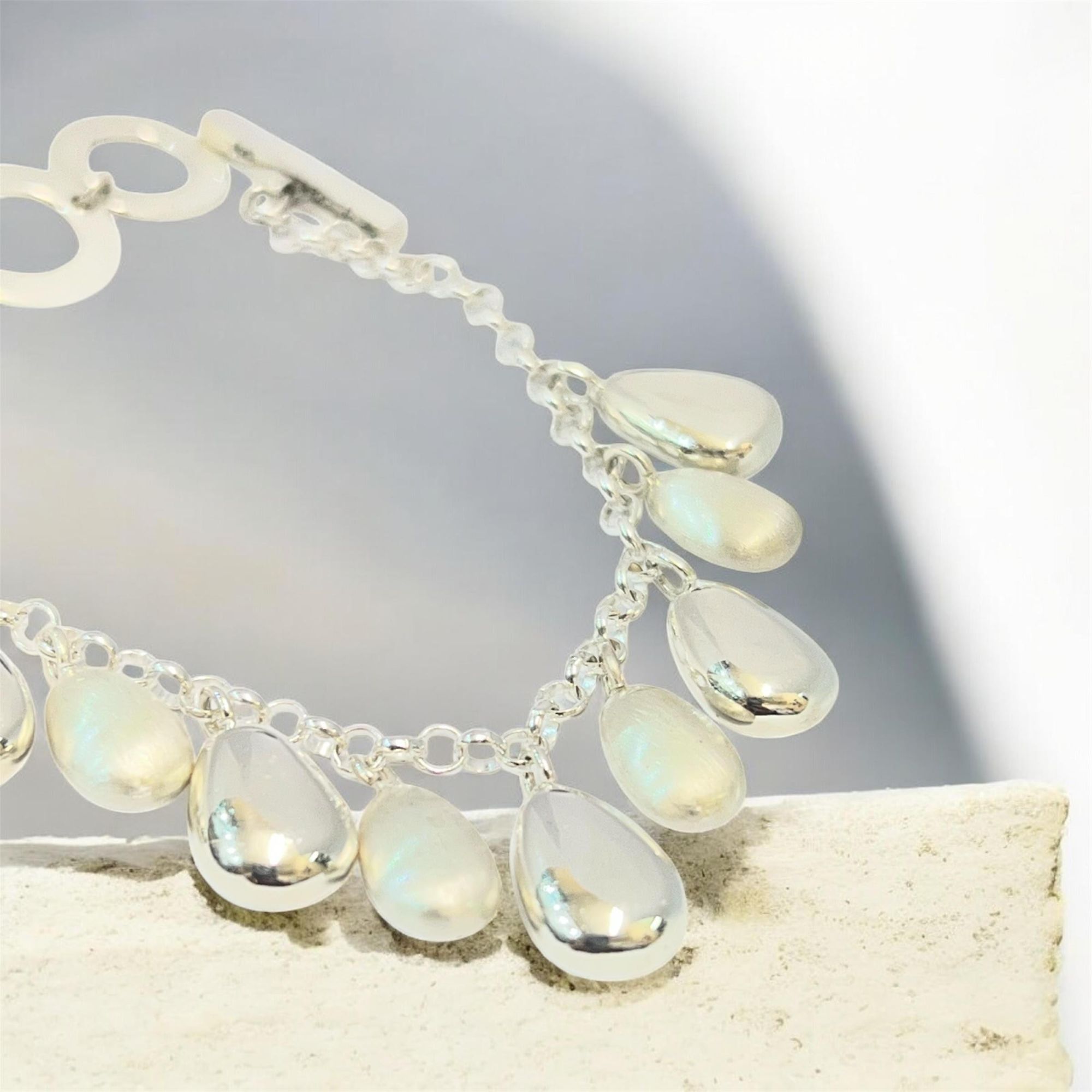 This elegant bracelet captures the serene beauty of nature through its fluid design of alternating polished and brushed silver pebbles. Each pebble is individually crafted in solid sterling silver, creating a striking contrast between mirror-like shine and soft matte textures. The organic shapes evoke the smoothness of river stones, bringing a touch of natural sophistication to any look.