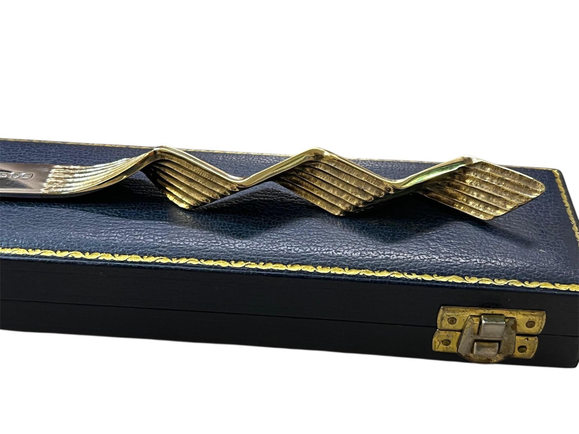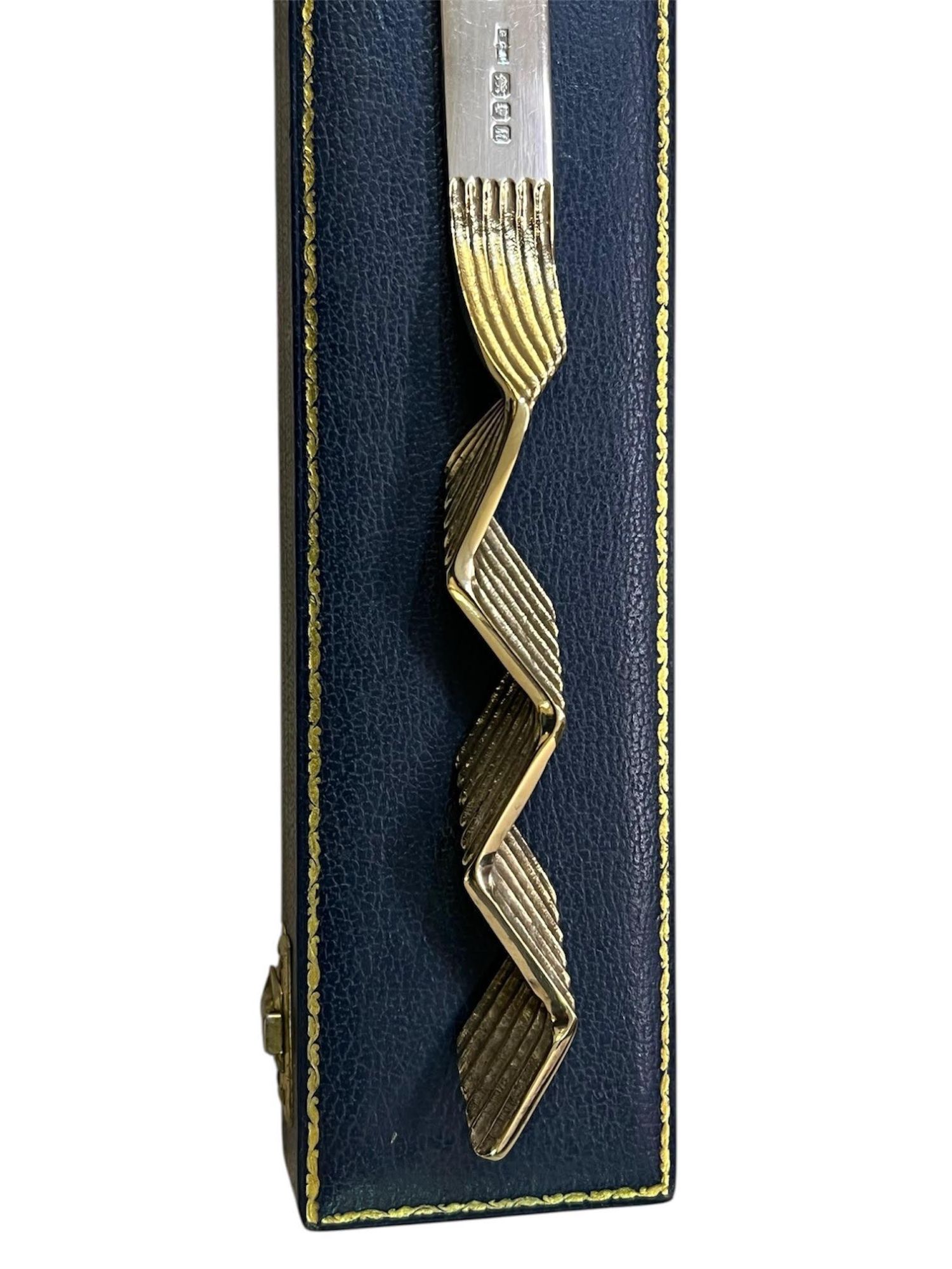 The letter opener features a polished silver blade contrasted with a striking silver-gilt zig-zag handle, giving it a distinctive late 20th-century design aesthetic. The crisp London hallmarks and maker's mark are clearly struck, confirming its quality and authenticity.