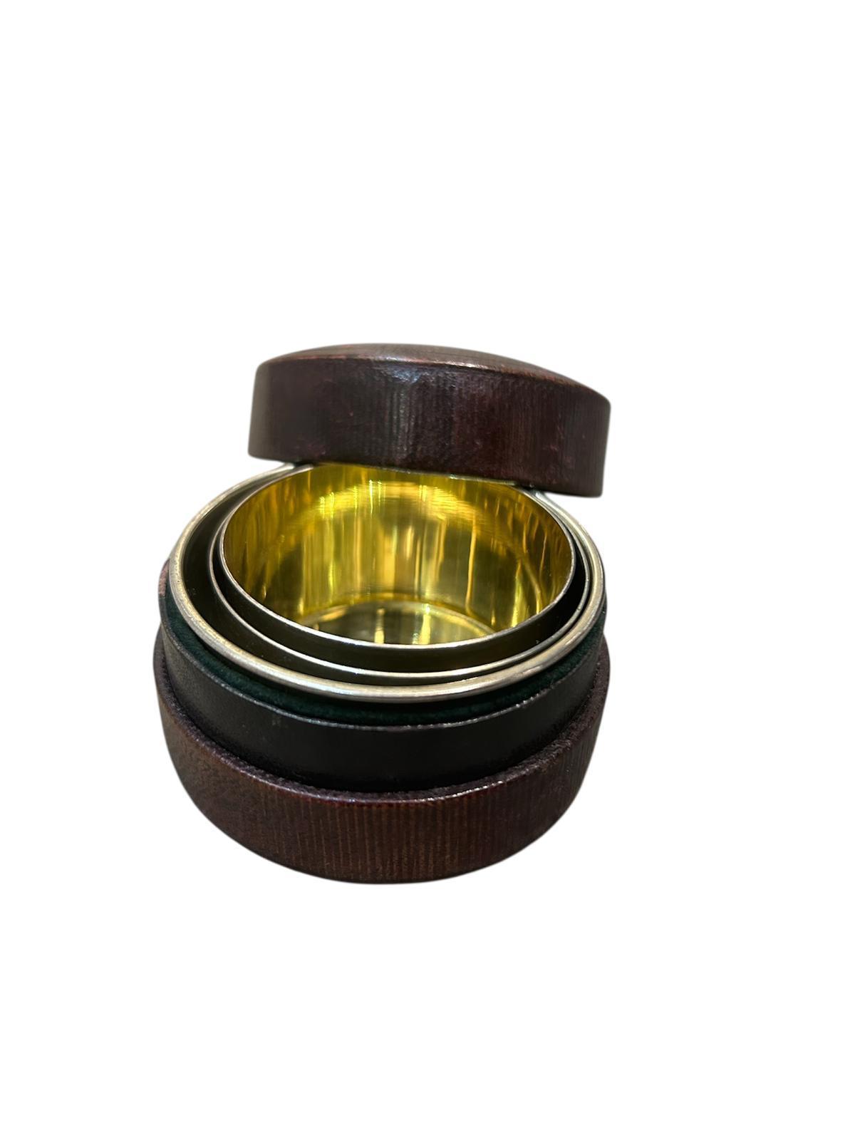 Antique silver plate collapsable cup. This travel beaker / bar accessory is three pieces that expand to be a 6 ounce drinking cup, and fold down into pocket size and comes with a leather case when not in use. An elegant way to sip on the go.
