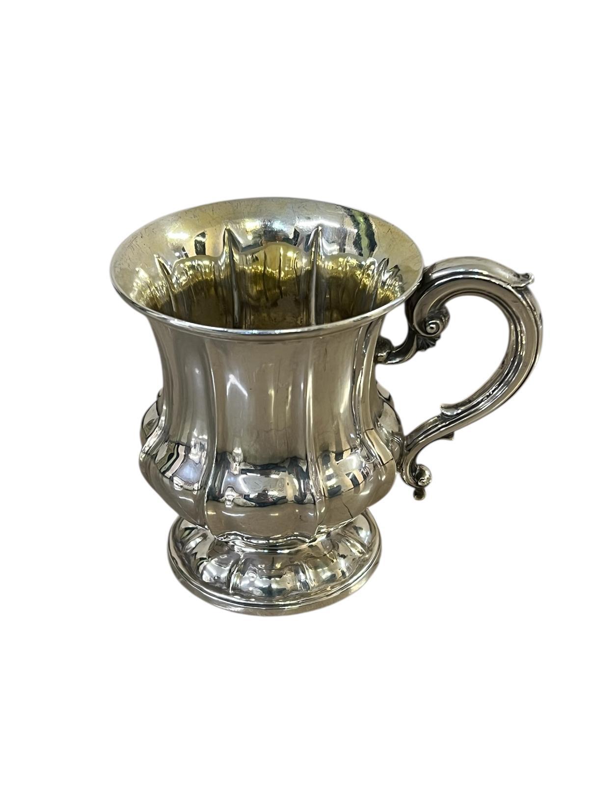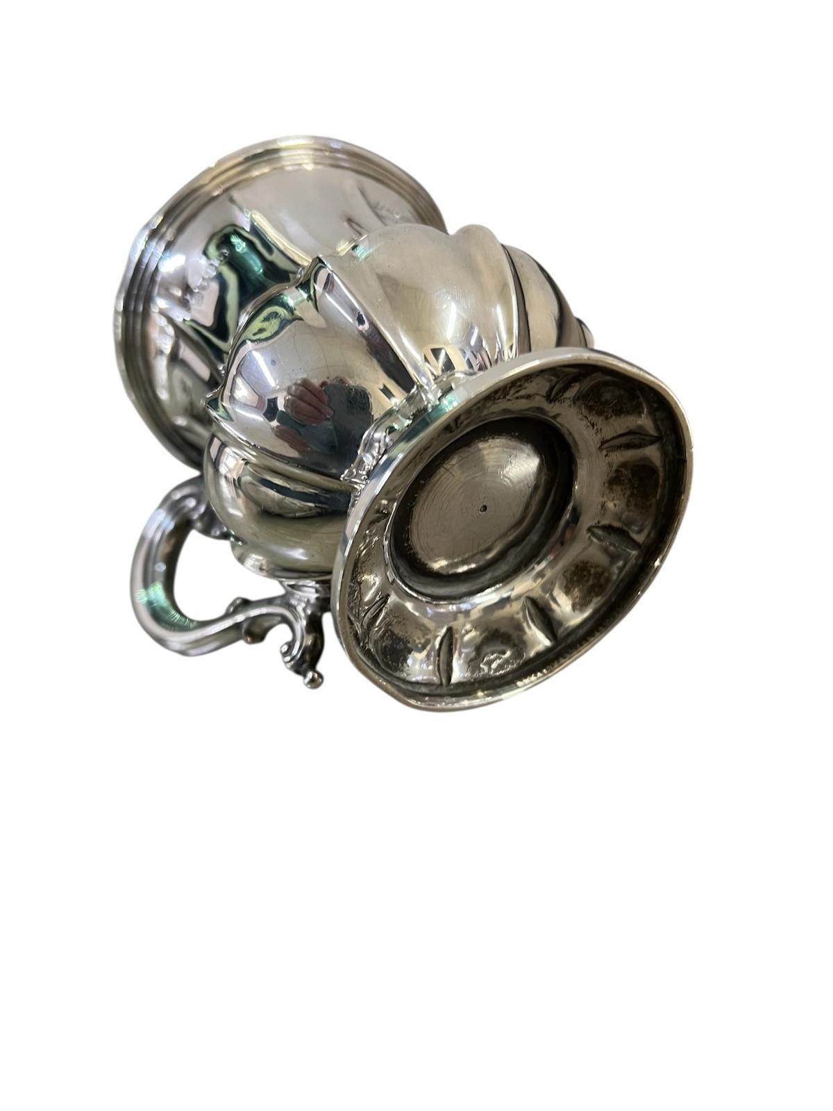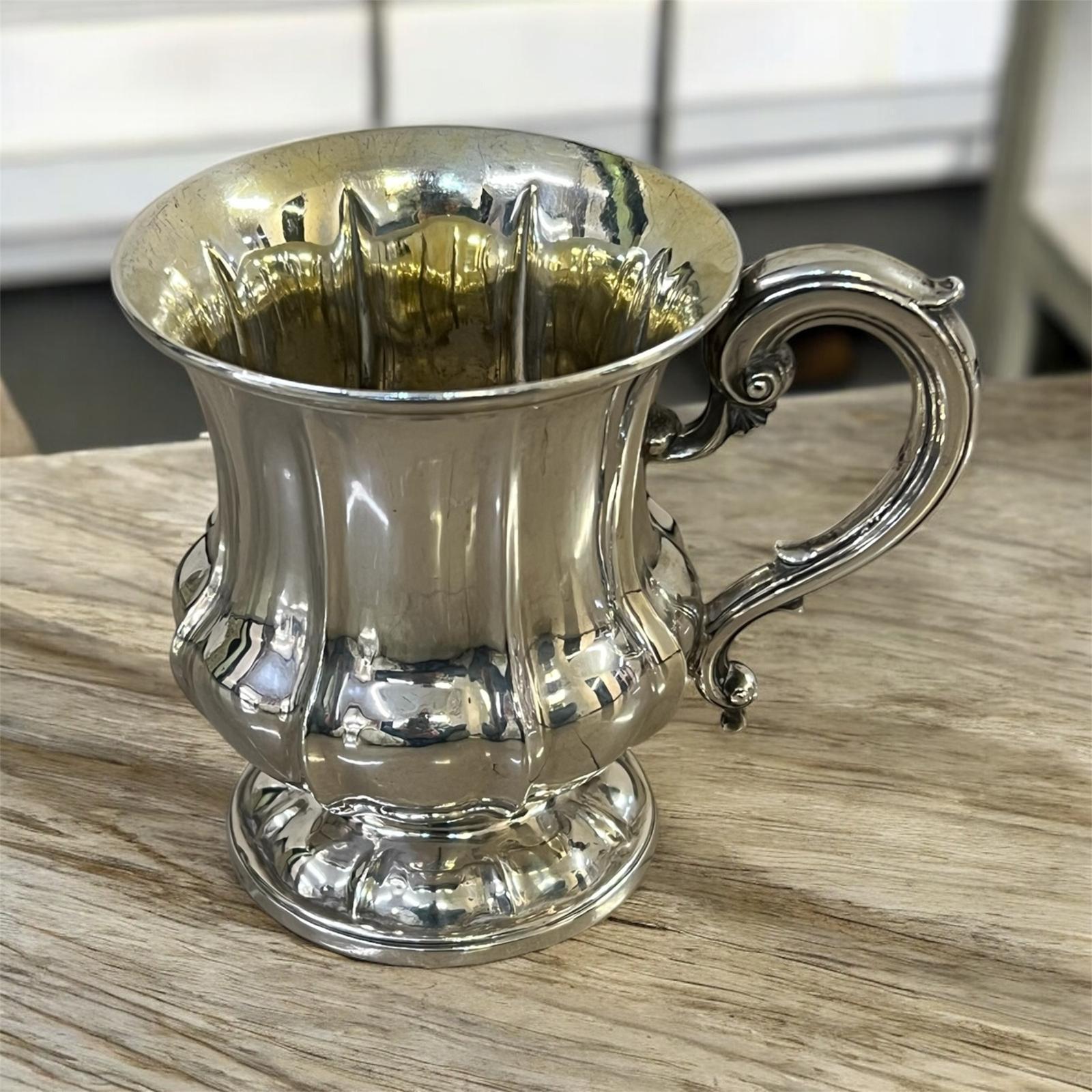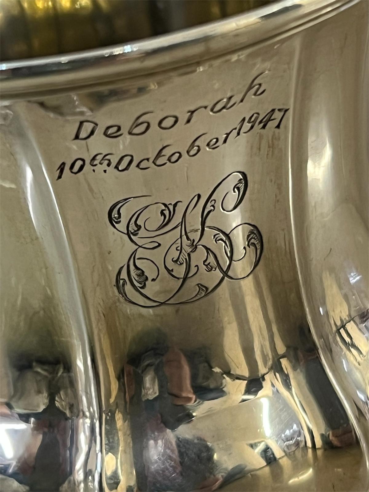 The mug features a classic baluster form with pronounced lobed sides, a shaped foot, and an elegant scroll handle. The interior retains its original gilt wash, adding both warmth and practical protection. The body is further enhanced by a beautifully engraved script inscription Deborah -10th October 1947, accompanied by a decorative monogram, reflecting its later presentation history.